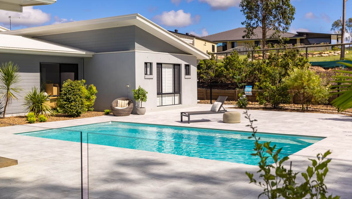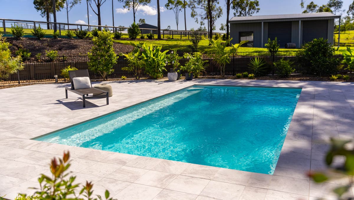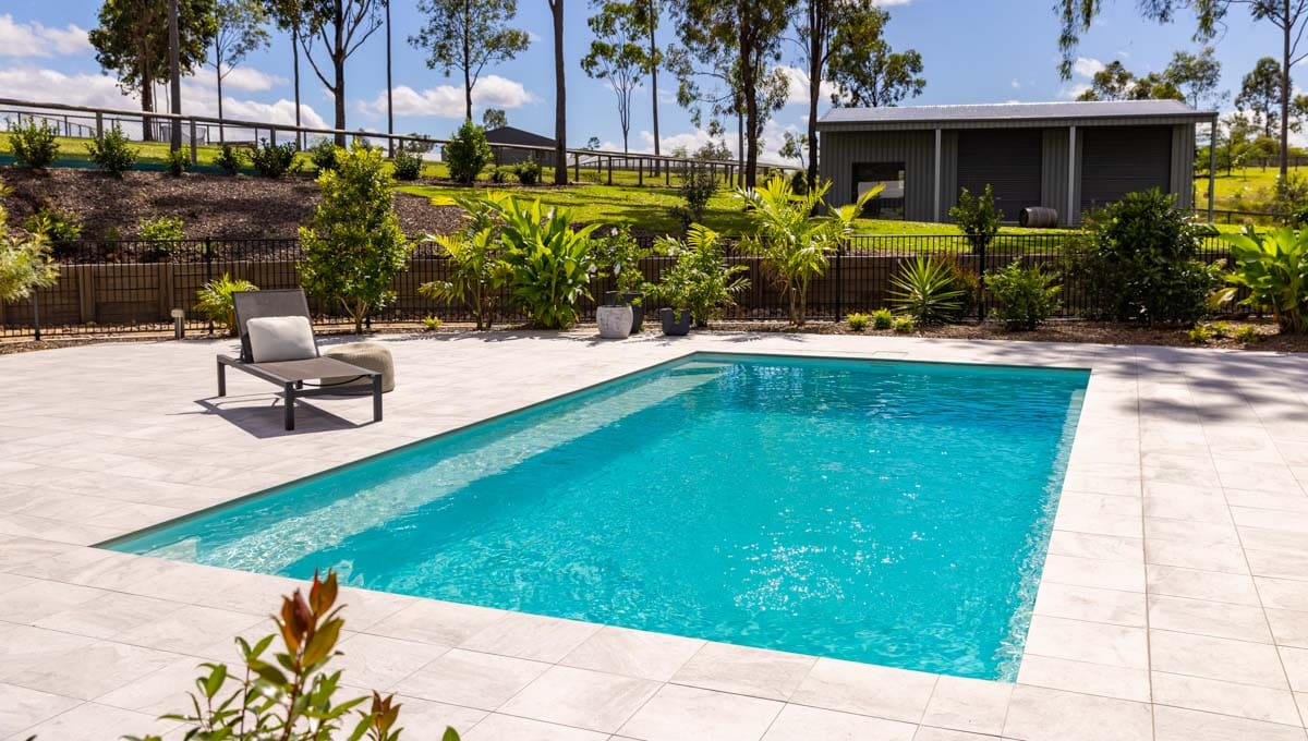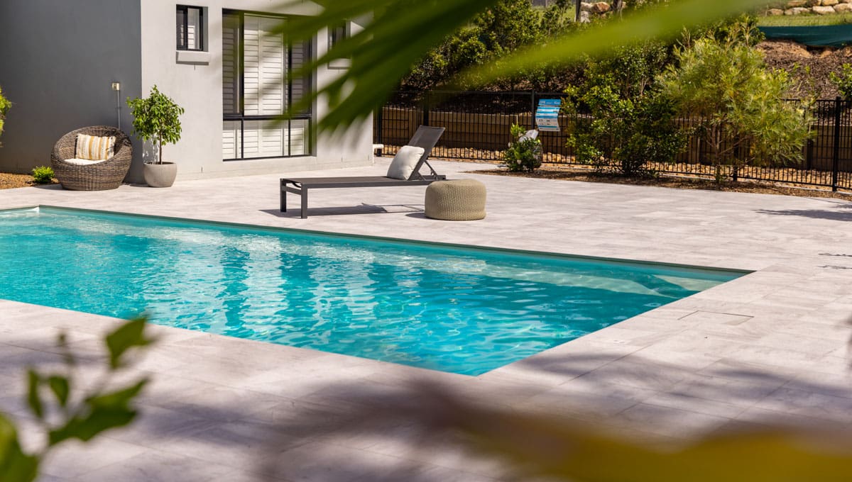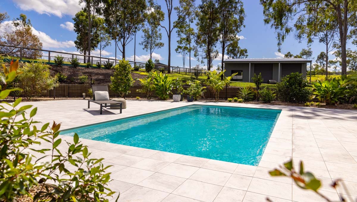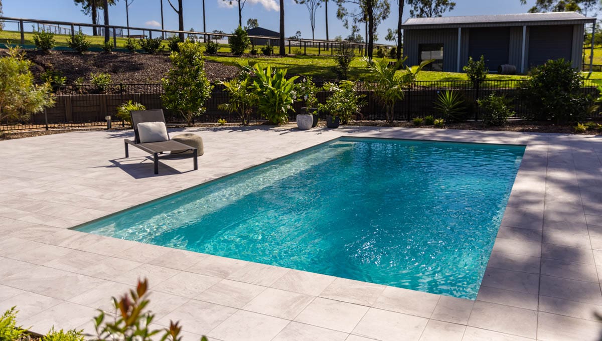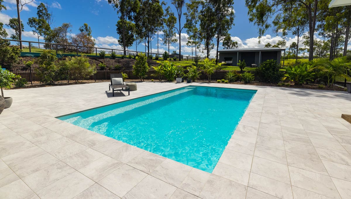 Introducing the Brampton 10.1m x 4.4m pool in Royal Alpine White Shimmer, showcasing striking geometric features that beautifully complement both modern and timeless landscapes.