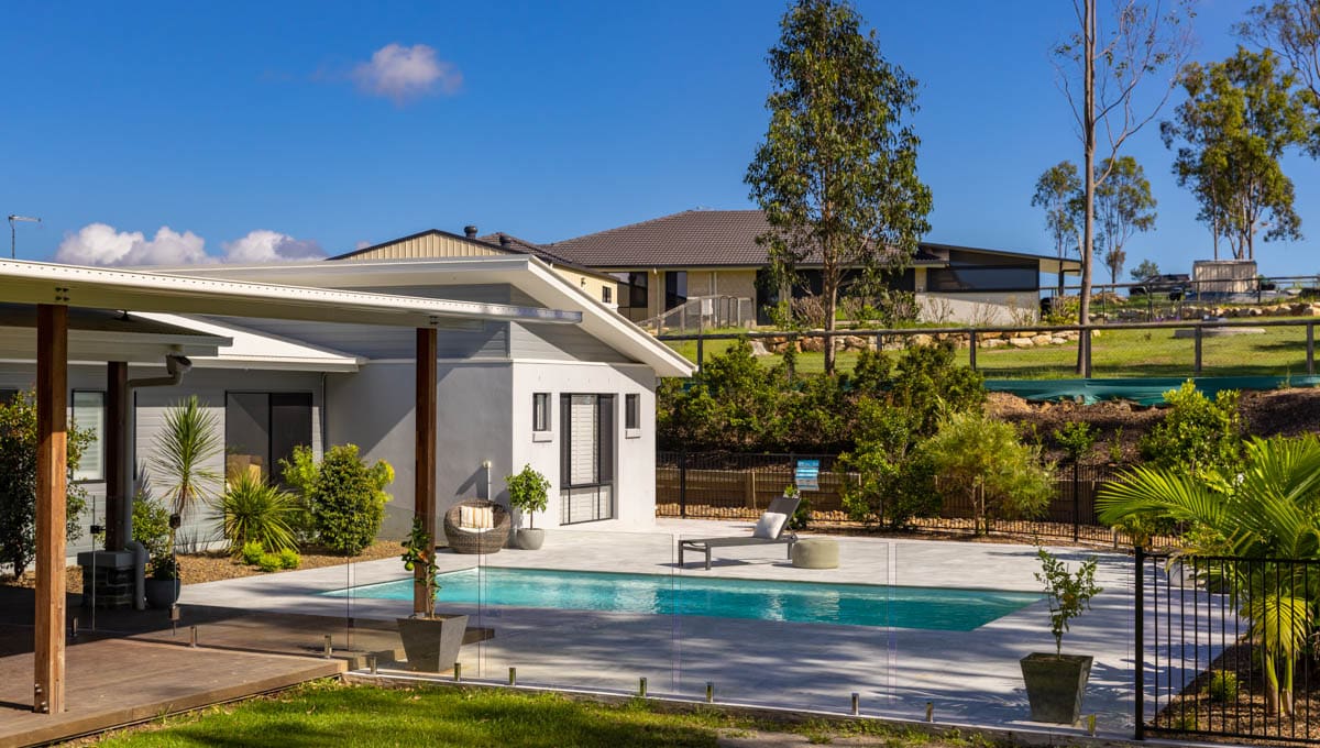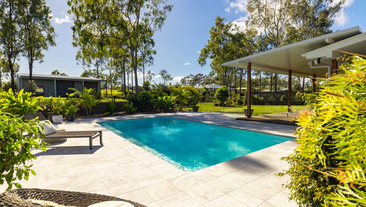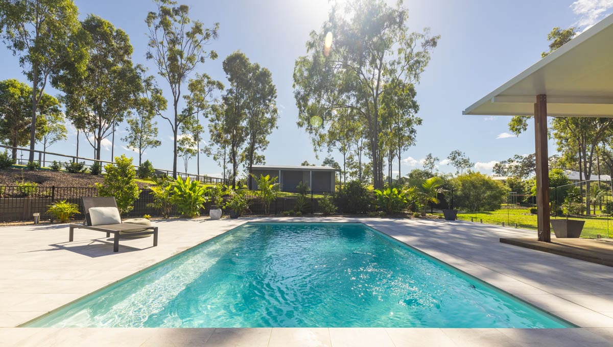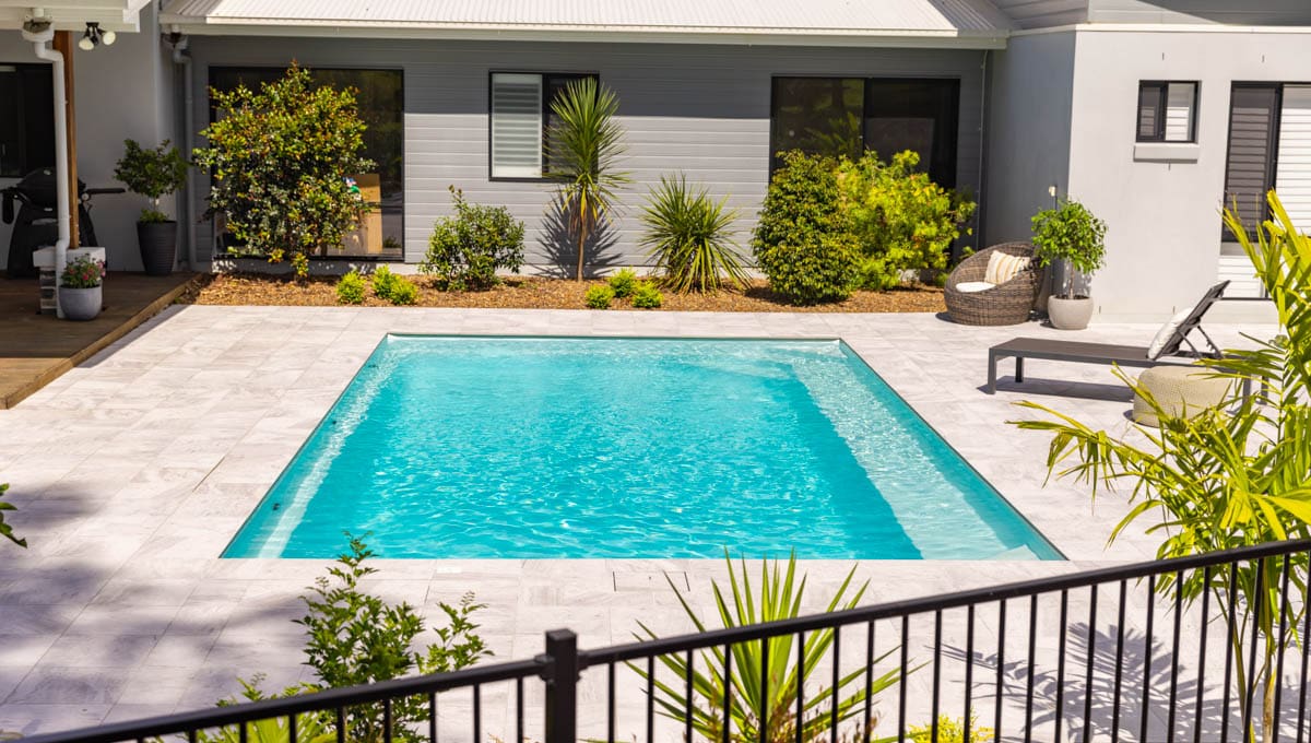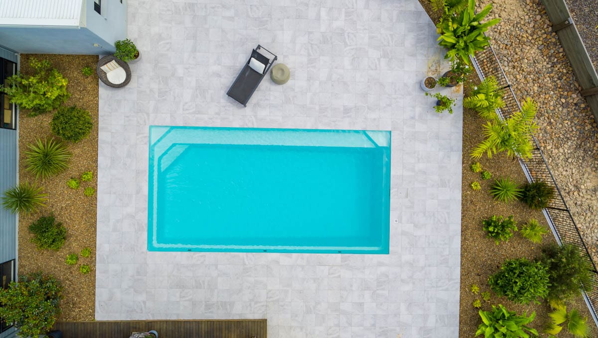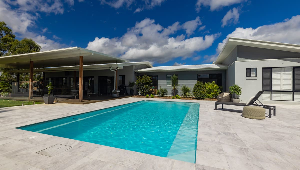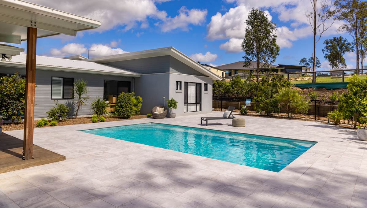 Introducing the Brampton 10.1m x 4.4m pool in Royal Alpine White Shimmer, showcasing striking geometric features that beautifully complement both modern and timeless landscapes.