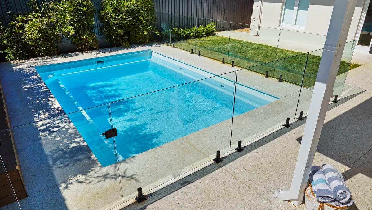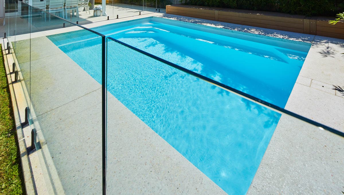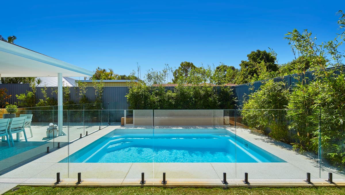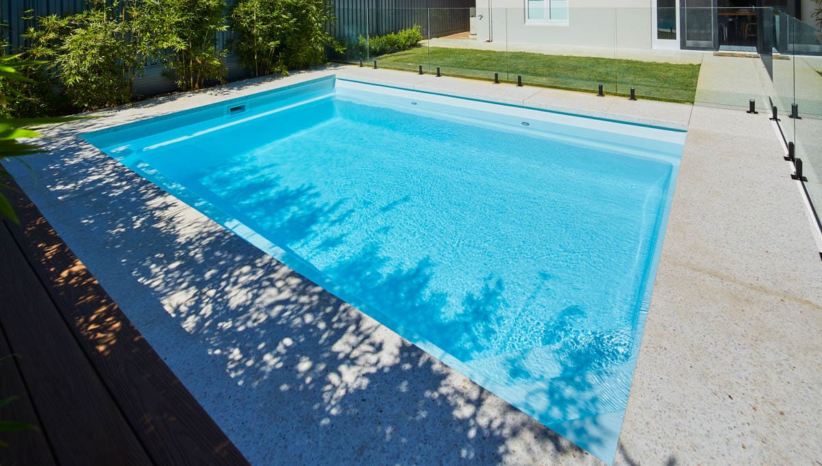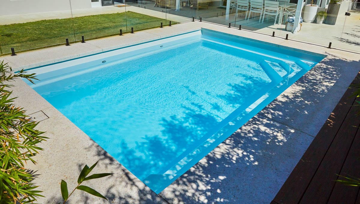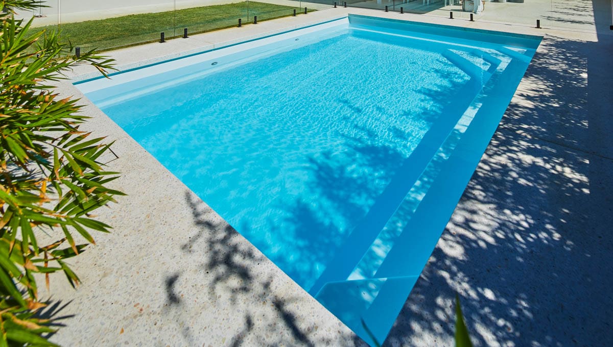 Introducing the Brampton 6.2m x 4.4m pool in Royal Alpine White Shimmer, showcasing striking geometric features that beautifully complement both modern and timeless landscapes.