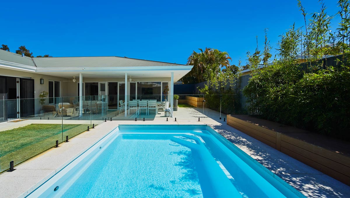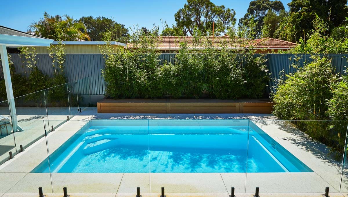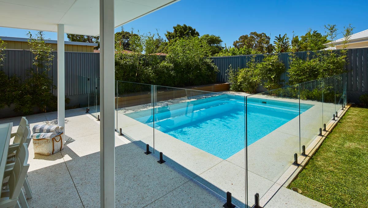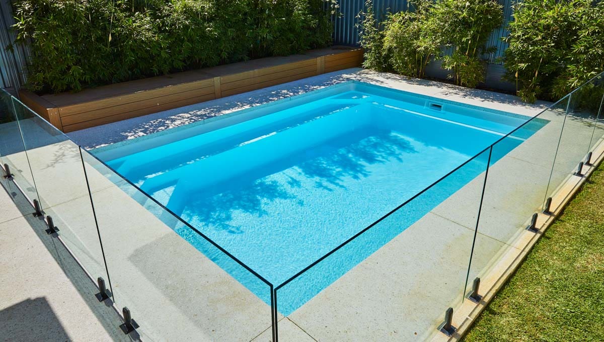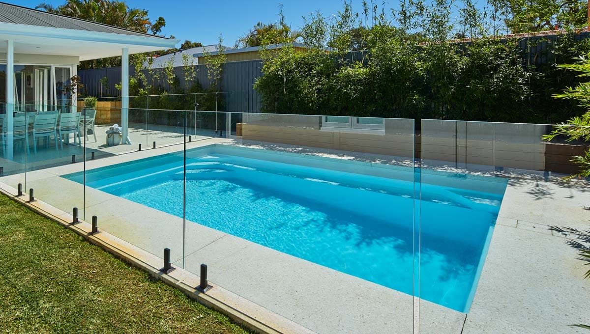 Introducing the Brampton 6.2m x 4.4m pool in Royal Alpine White Shimmer, showcasing striking geometric features that beautifully complement both modern and timeless landscapes.