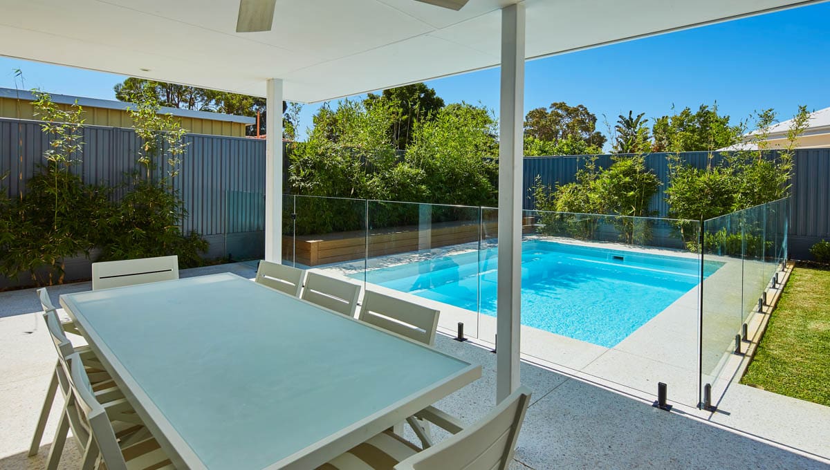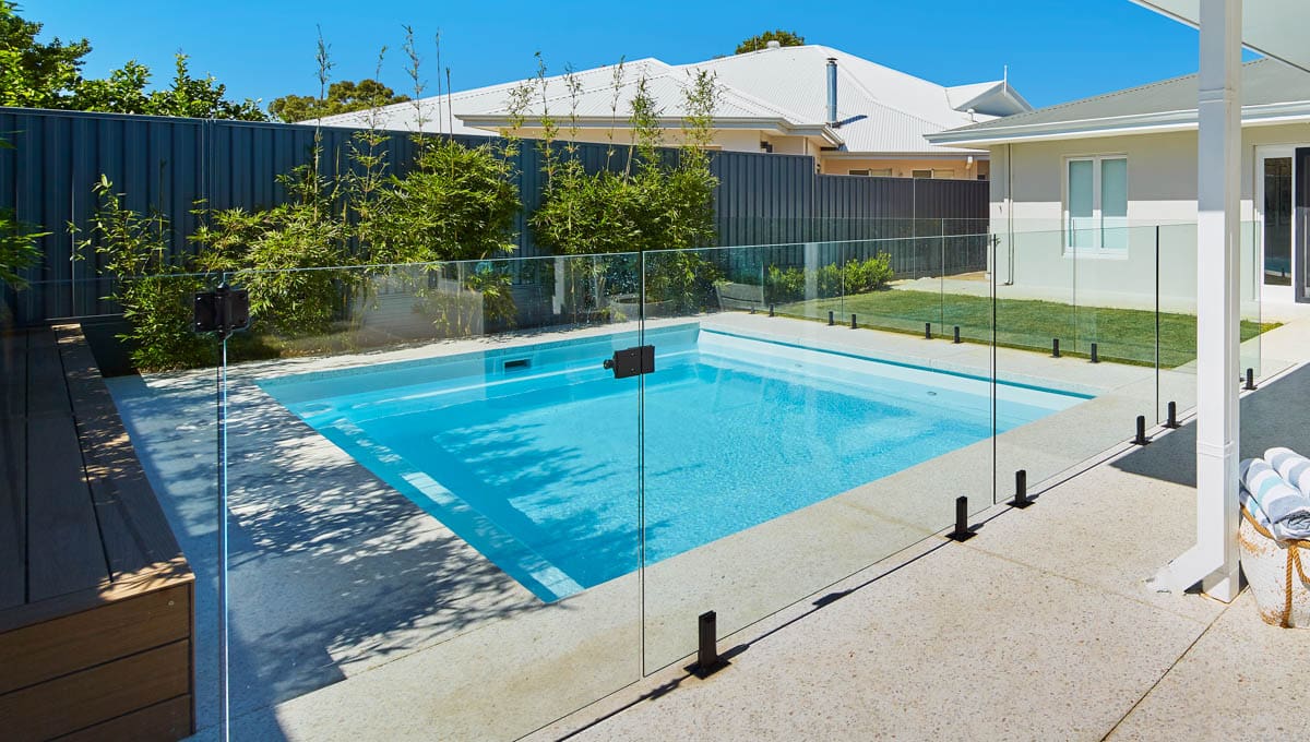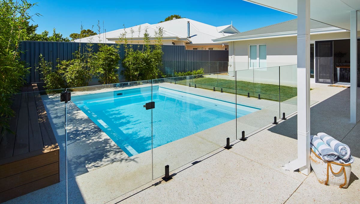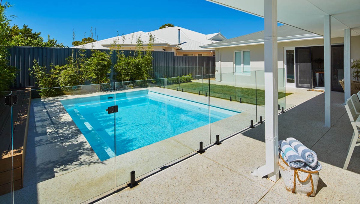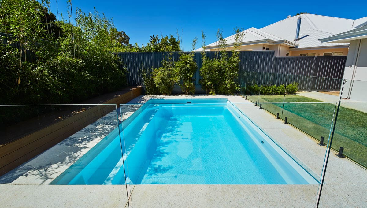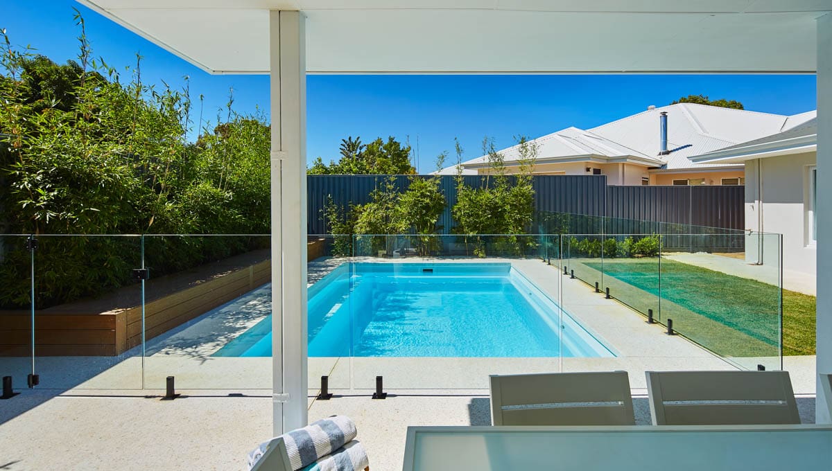 Introducing the Brampton 6.2m x 4.4m pool in Royal Alpine White Shimmer, showcasing striking geometric features that beautifully complement both modern and timeless landscapes.