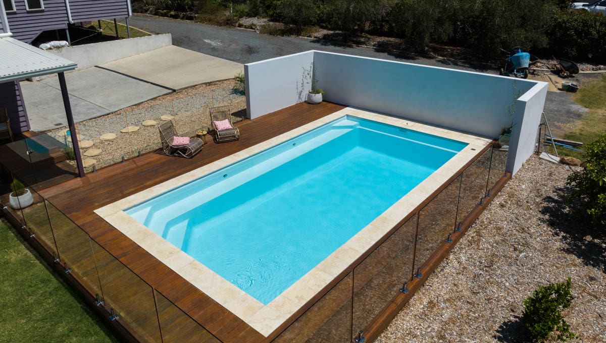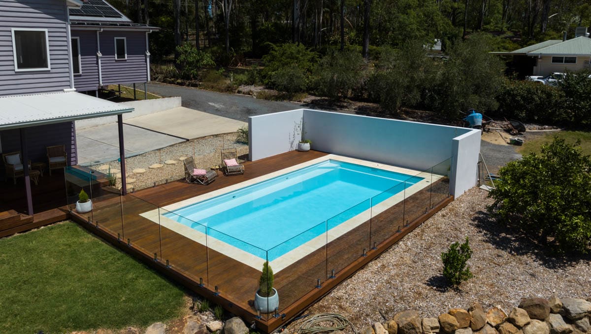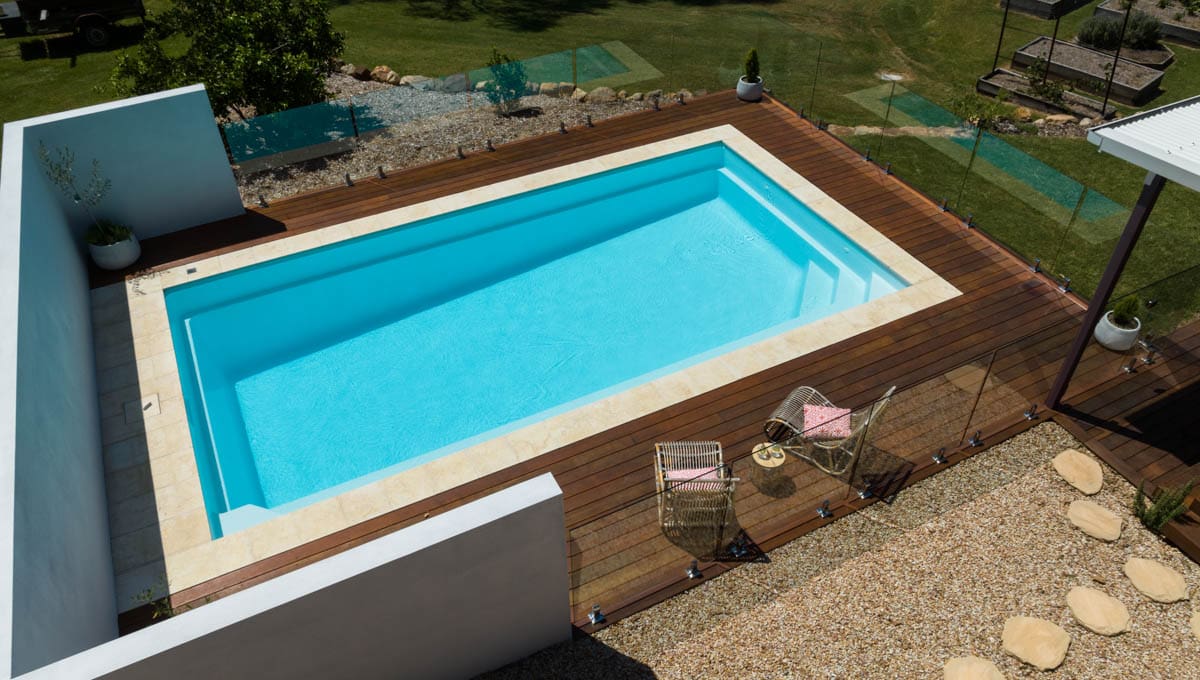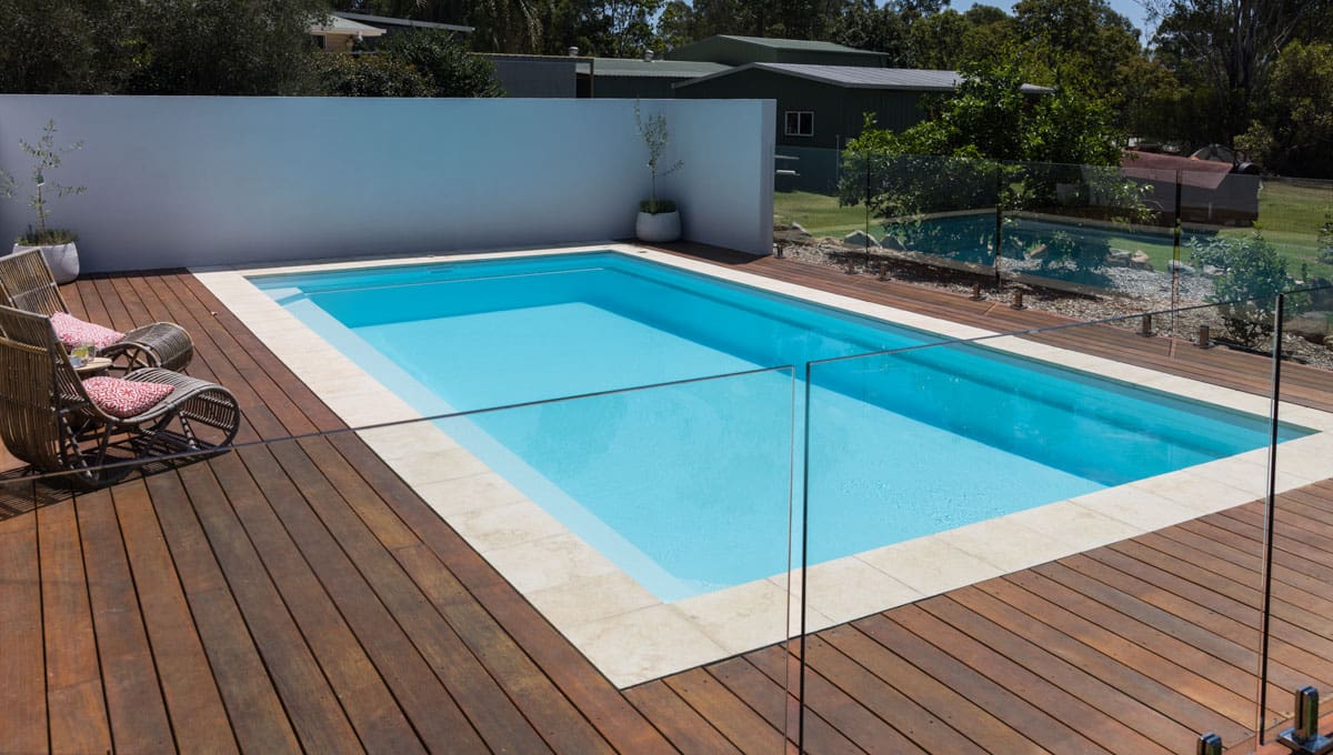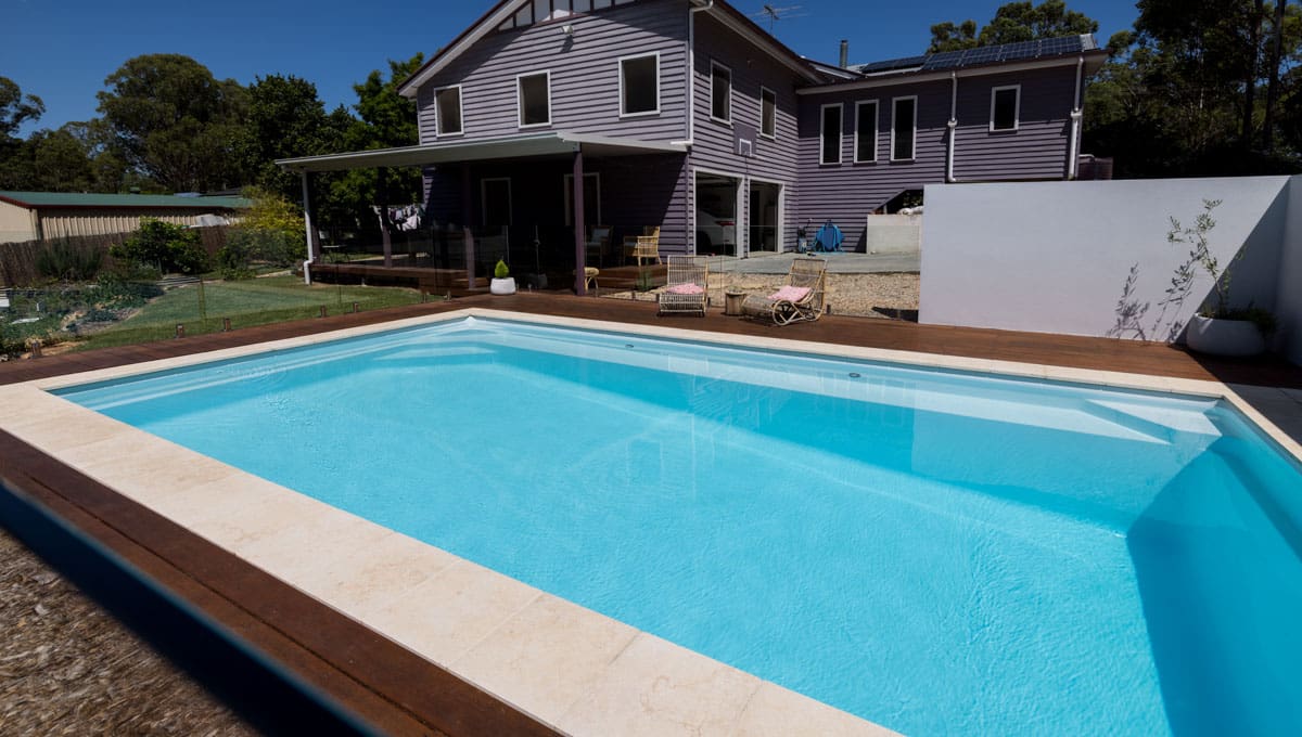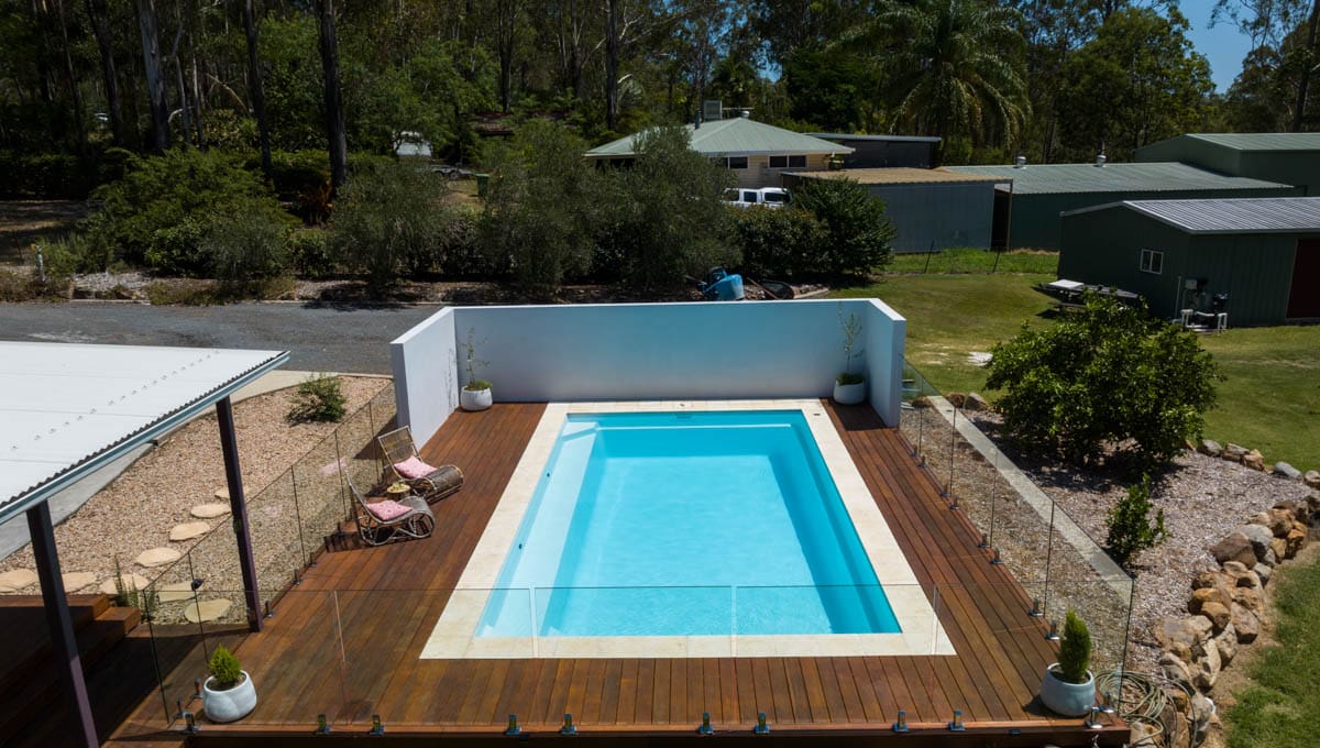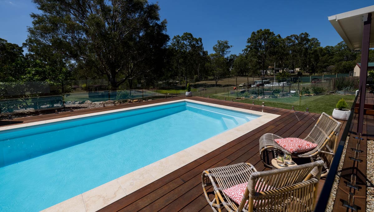 Our Brampton pool in our classic Alpine White Shimmer is the perfect colour for this Jimboomba home. Perfectly contrasted against the earth tones of the backyard, this massive 8.2m x 4.4m is ideal for splashing around and for cooling off. A bench seat running across the long side of the pool allows you to kick back and relax. We’re glad we were able to bring another local Jimboomba family’s dream of owning a fibreglass pool to life!