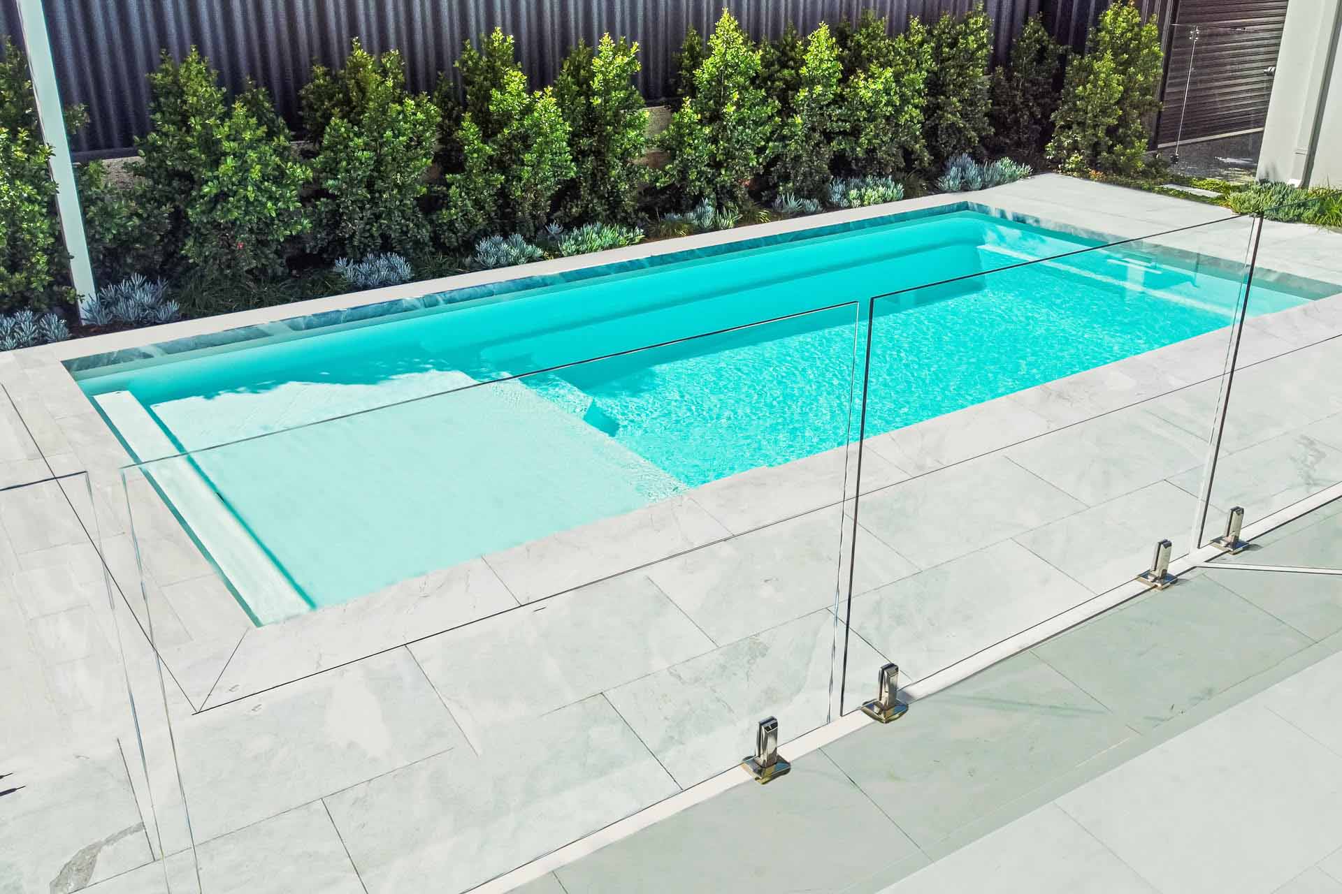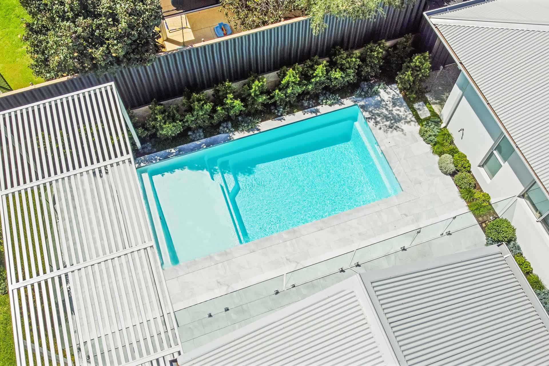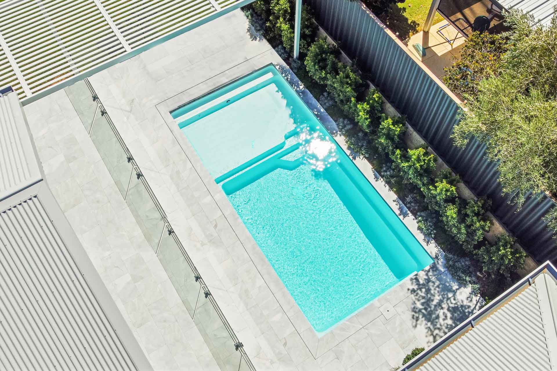 The Sunseeker 8.2m is one of our more recent designs in our extensive pool range. This pool features our Royal Alpine White Shimmer colour. This simplistic, clean design truly has it all, along with a full-length step for easy access, a massive splash deck for simply lazing around with family and friends or utilise this space as a fun-filled kids play area. With recessed steps, the Sunseeker Series has an uninterrupted swimming section.